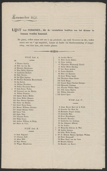 Lijst van personen, die de vereischten bezitten om tot Kiezer te kunnen worden benoemd, Leeuwarden 1848