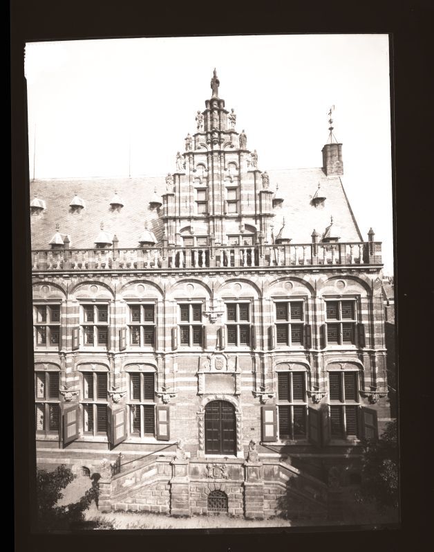 Een van negen negatieven van foto's van gebouwen in Leeuwarden, waaronder de Kanselarij