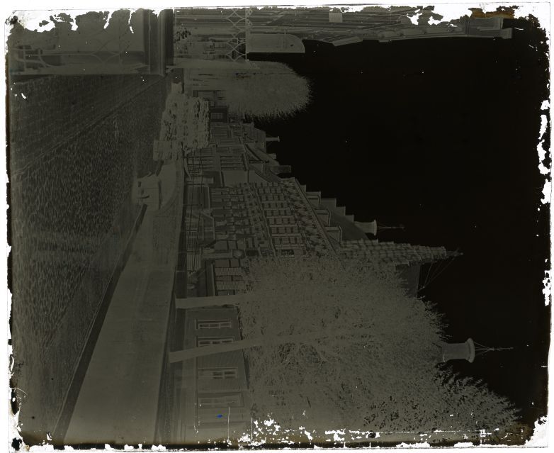Glasnegatief met afbeelding van de Tweebaksmarkt te Leeuwarden met kanselarij voor demping ca. 1870.