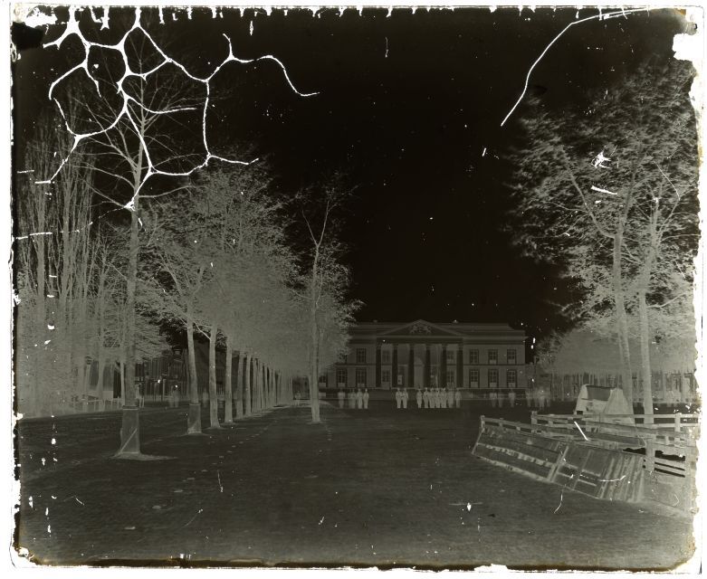 Glasnegatief met zicht op het Wilhelminaplein met gerechtsgebouw. ca. 1870.