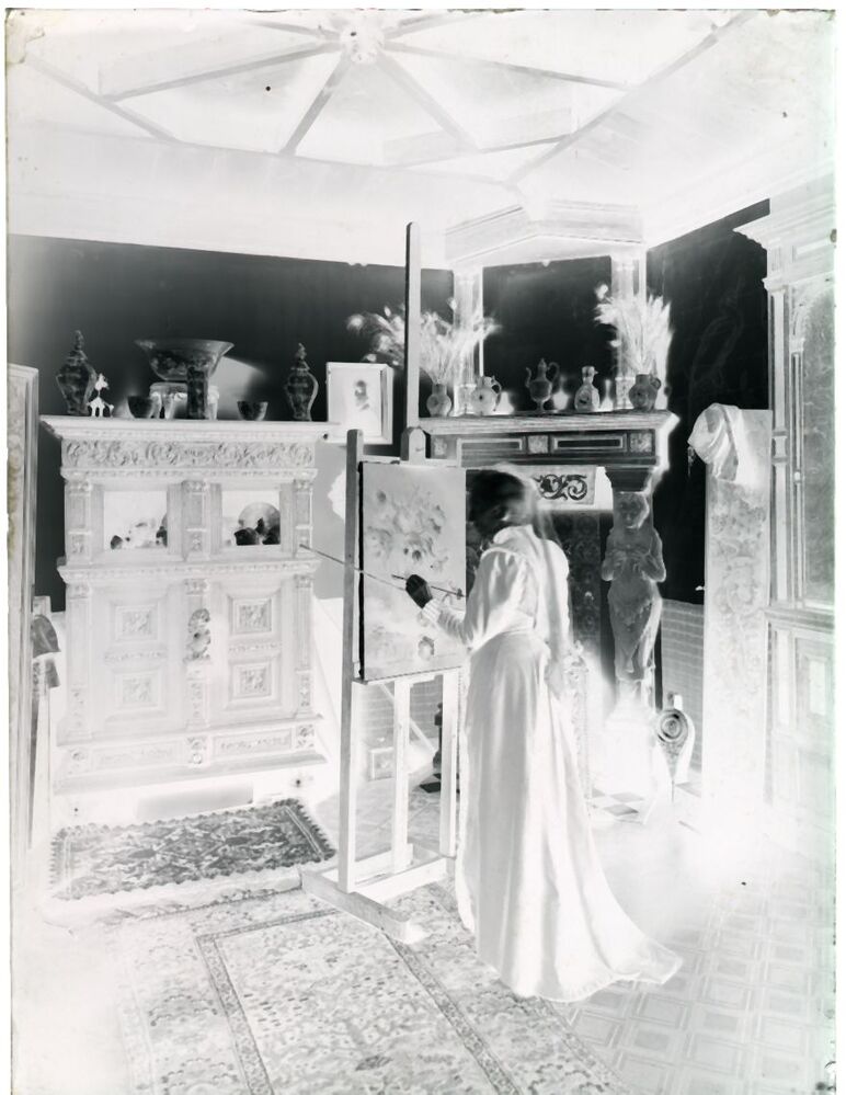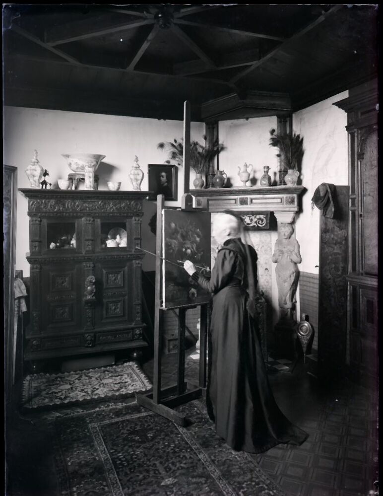 De schilder Kate Bisschop-Swift in haar atelier op de eerste verdieping van villa Frisia in Den Haag