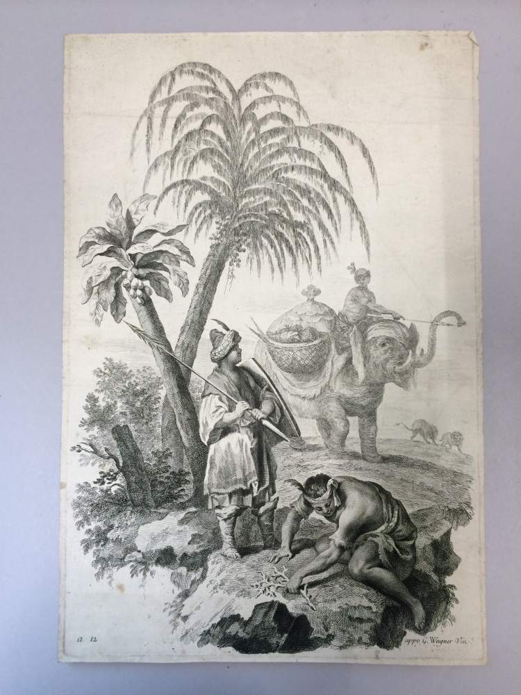 Ornamentprent. Landschappen met verbeelding van werelddelen. Afrika.