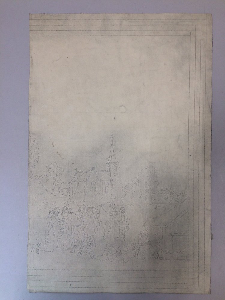 Spons met een groep mannen en vrouwen, met op de achtergrond een kerk