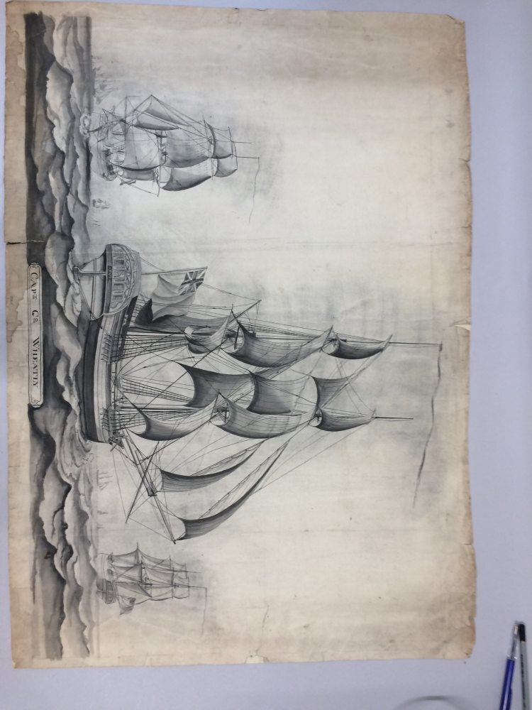 Spons/ontwerptekening van een aantal schepen, in water en inkt, titel Capt C° Wheatly