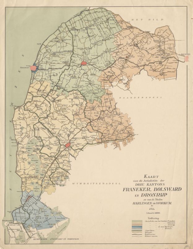 Kaart van de Jurisdictiën der drie kantons Franeker, Bolsward en Dronrijp en van de steden Harlingen en Workum in 1811