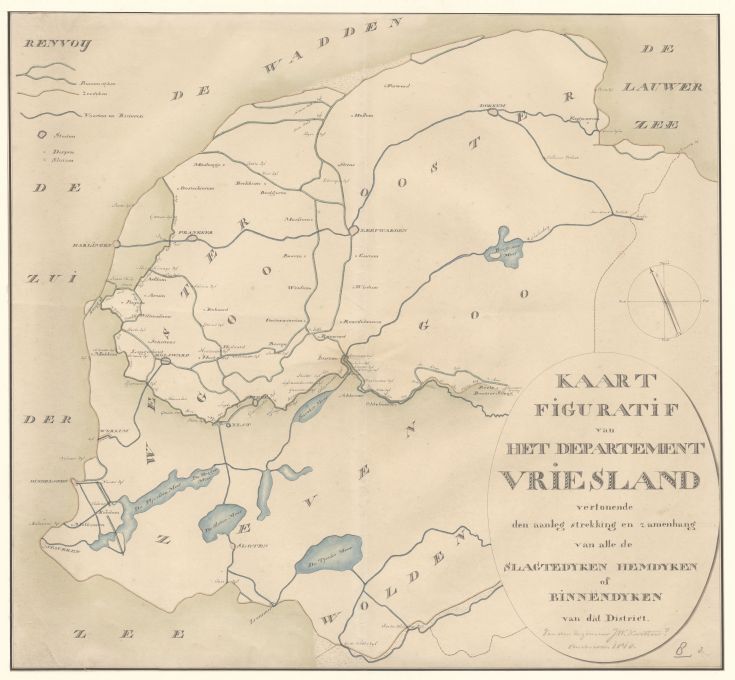 Figuratieve kaart van het Departement Vriesland die de aanleg van de dijk vertoond