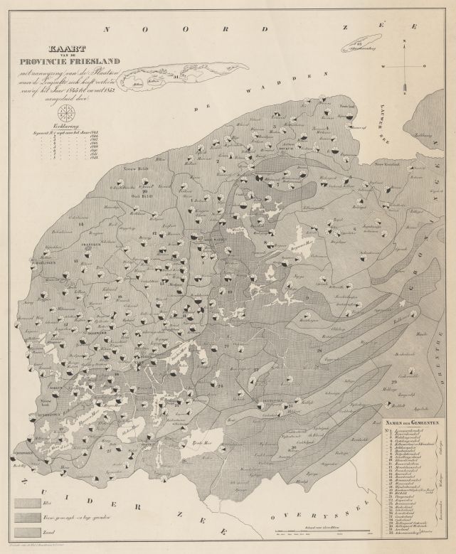 Kaart met plaatsen in Friesland waar longziekte voorkwam