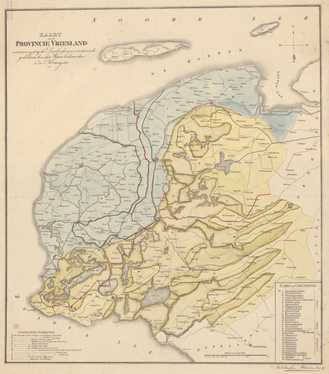Kaart van Friesland met de grondsoorten en de dijken van de Middelzee