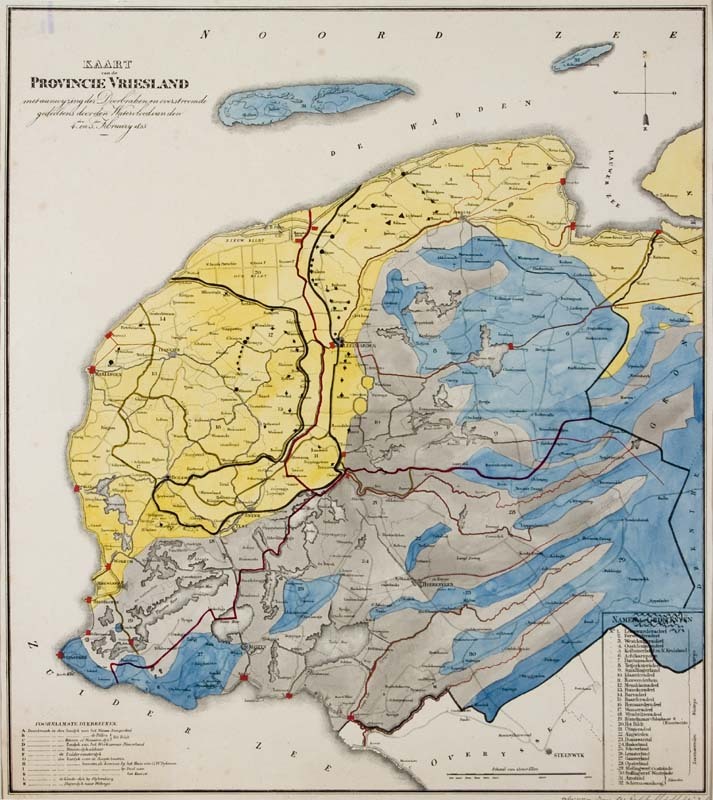 Kaart van Friesland met binnendijken, grondsoorten en terpen