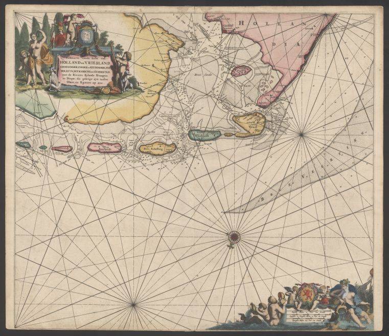 Een van twee delen van een zeekaart, paskaarte van de kuste van Holland en Vlieland, Groningen, Emden en Reydingaland