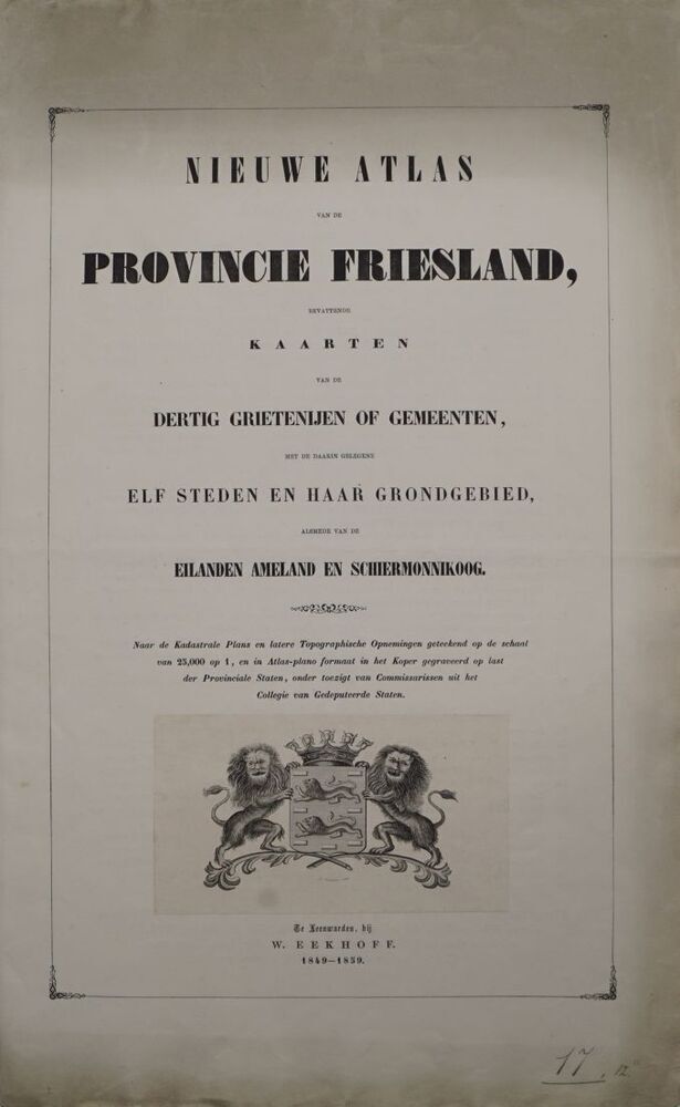 Titelblad, onderdeel van titelblad met wapen van Friesland en inhoud en historisch overzicht van de nieuwe atlas van de provincie Friesland