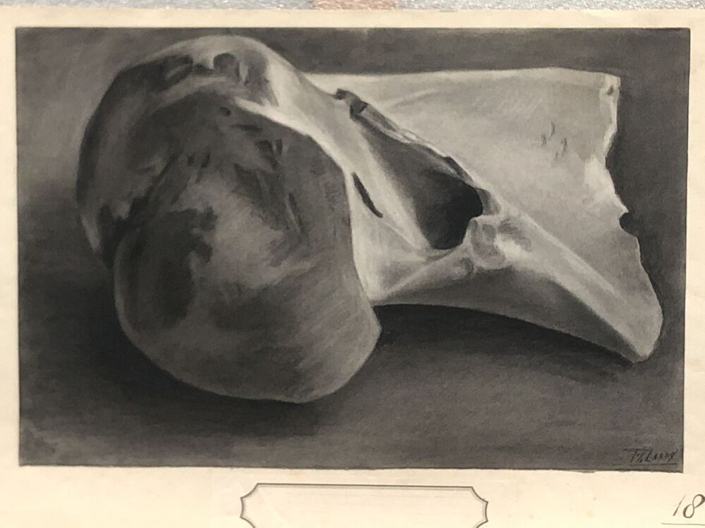 Tekening in zwart en wit krijt van beenderen van een walvis