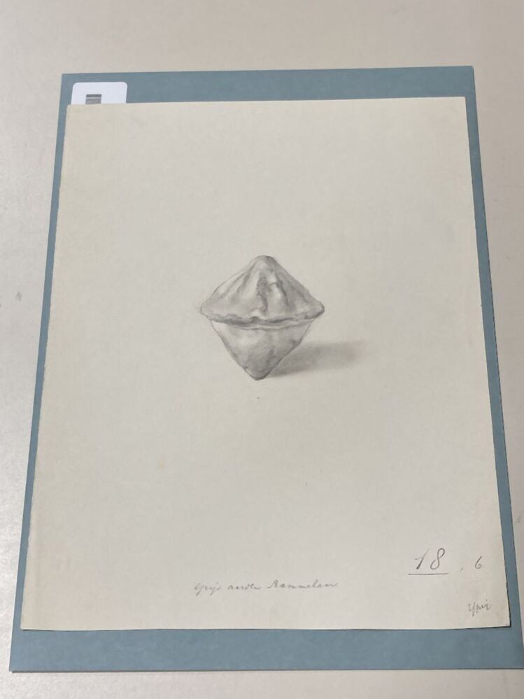 Tekening in potlood van een rammelaar van grijs gebakken aarde