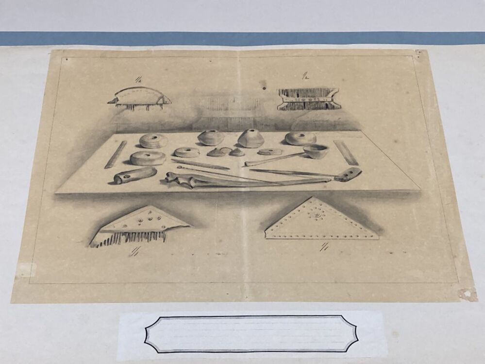 Tekening in potlood van spinklosjes, visnetschijven, enz.