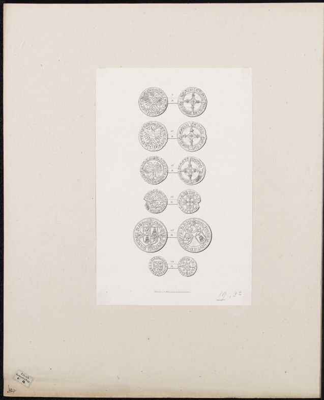 Afbeelding van zes munten of penningen van Egbert II, geslagen te Dokkum, Stavoren, Bolsward, Leeuwarden enz.