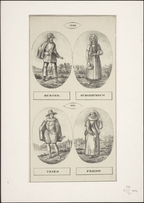 Klederdracht van oude Friezen en Friezinnen omstreeks 1200 en 1550