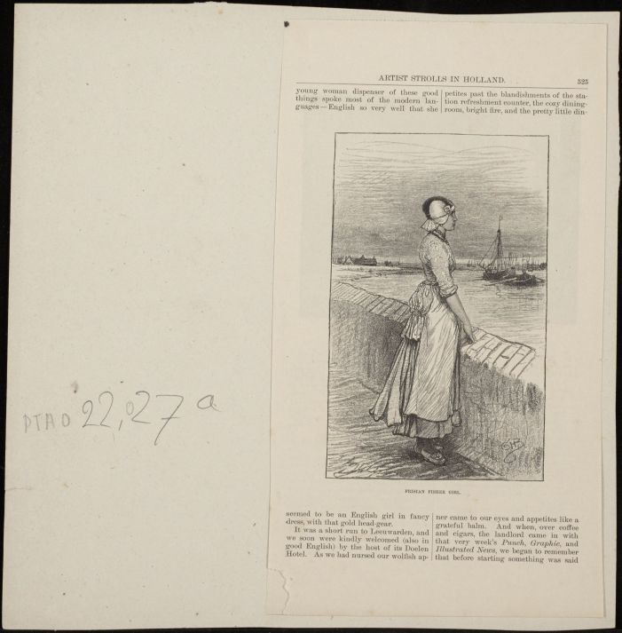 Blad met tekst en een Fries vissersmeisje aan de kade omstreeks 1880