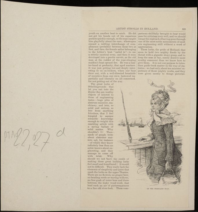Blad met tekst en een vrouw op een boot omstreeks 1880
