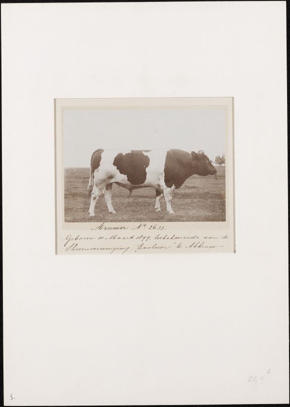 Stamboekstier Arumer No. 2633 die geboren is in 1899 en toebehoort aan de Stierenvereniging Exelsior te Akkrum