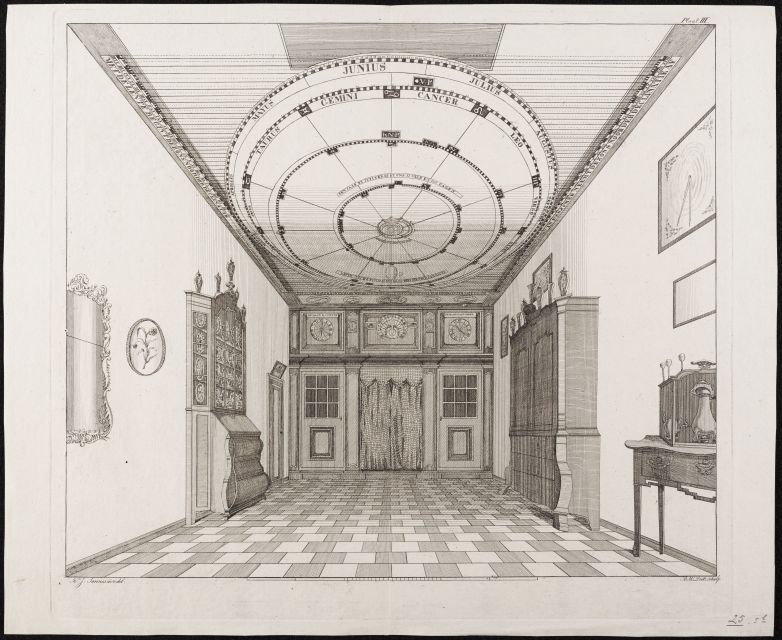 Gezicht met het bewegende planetarium van Eise Eisinga in zijn huis te Franeker