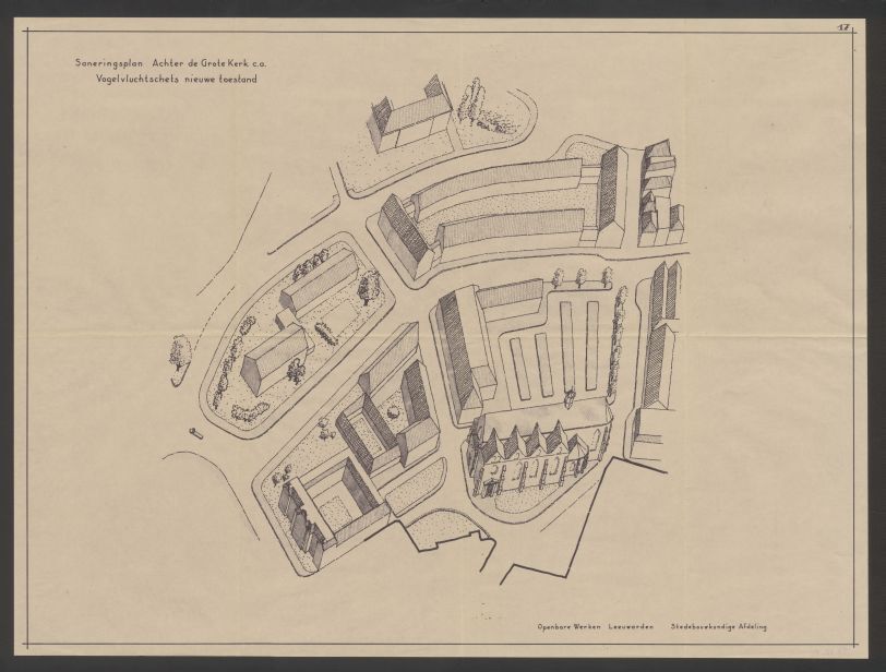 Saneringsplan voor Achter de Grote Kerk te Leeuwarden. Een schets in vogelvlucht van de nieuwe toestand.