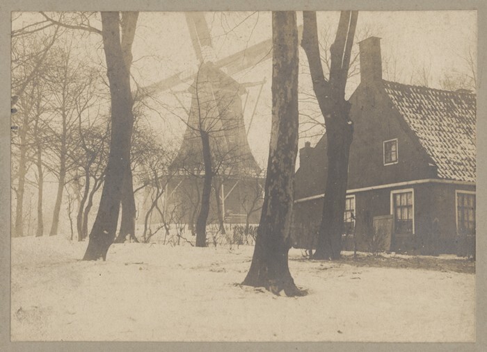 Gezicht van achter het Schavernek in de Westerplantage naar de molen de Arend te Leeuwarden