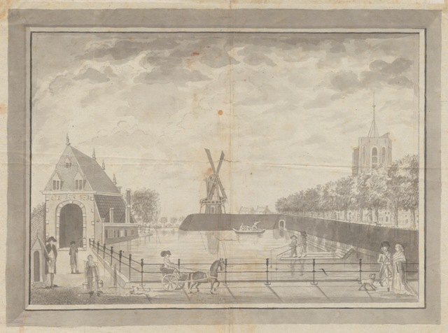Gezicht op de buitenpoort van de O.L. Vrouwenpoort en de Oldehove te Leeuwarden