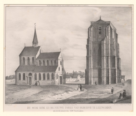 Gezicht op de St. Vituskerk en de Oldehove te Leeuwarden