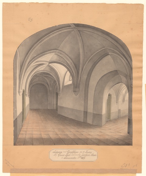 Gezicht op de gang met gewelfbogen in de Kosterij van de Grote Kerk te Leeuwarden