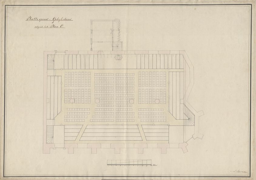 Voorstelling in lijnen van een architectonisch object langs geometrische weg, die niet een indruk weergeeft, zoals het gebouw door het menselijk gezicht gezien kan worden, maar de abstracte driedimensionale gedaante van het object, verkregen door stelselmatige berekening en opmeting. De weergave geschiedt op schaal en meestal in orthografische projectie. Voor de aanschouwelijkheid worden er soms perspectivische voorstellingen bijgevoegd. Een stel architectuurtekeningen bestaat gewoonlijk uit plattegrond(en) of horizontale doorsnede(n), gevelopstanden, lengte- en dwarsdoorsneden, vaak ook details. Zoals hiervoor werd aangeduid, is de architectuurtekening:–ontwerp voor een voorgenomen bouwwerk of bouwdeel, ev. met varianten. Voor de uitvoering zijn nog werktekeningen nodig. In het eerste stadium kan een ontwerp schetsmatig, algemeen oriënterend en suggestief zijn. In alle perioden sinds de vroege M.e. zijn ontwerptekeningen gemaakt. Ook symbolische ontwerpen, zoals het Pantheon der Mensheid van Berlage uit 1915, kan men hiertoe rekenen.–opmeting van een bestaand object, ter herinnering, als voorbeeld, met het oog op herstel, ev. een reconstructie, b.v. het schetsboek van Villard de Honnecourt (c. 1235), de talrijke restauratie-ontwerpen van architecten in XIX-XX en de sinds de renaissance geliefde reconstructie van antieke bouwwerken. Het oudst bekende document op dit gebied is de plattegrond voor de abdij van St.-Gallen in Zwitserland, dat in het archief van deze abdij bewaard is. Het is een ideaal schema dat iemand uit de hofkring van Karel de Grote omstreeks 820 aan abt Gozbert toezond. Het is slechts gedeeltelijk verwezenlijkt, maar zeer belangrijk voor de kennis van de vroeg-m.e. aanleg van kloosters. De opstand van een aantal gebouwen is in het horizontale vlak neergeslagen, zoals ook op een schetsmatige plattegrond van c. 1150 van de abdij van Canterbury.Meer recht op de naam architectuurtekening heeft een aantal tekeningen uit de gotische tijd, waarvan wij aanstippen verschillende tekeningen in het Livre de portraicture van Villard de Honnecourt. Hier worden op geometrische basis (driehoeken, rechthoeken, diagonalen) onderdelen aangegeven betreffende de kathedraal van Reims en het maaswerk daarvan, roosvenster te Lausanne, toren van Laon, plattegronden van Meaux en Cambrai (Kamerijk). Verder bleven vele tekeningen uit XIII-XV bewaard, o.a. te Reims, Straatsburg, Keulen, Clermont, Limoges, St.-Quentin, Milaan, Wenen, Barcelona. Interessant zijn een ontwerp uit c. 1230 voor de O.L.V.kerk te Trier op een steen in een traptoren en M. Röritzers gedrukte boekje uit 1486 over ‘der Fialen Gerechtigkeit’. Ook in de Nederlanden bleven talrijke tekeningen bewaard, uit de late M.e. (torens te Breda, Mechelen, Zierikzee en Mons, stadhuis te Gent) en vele uit latere perioden. In het kasteel Cannenburch te Vaassen (Gld.) is een in de pleisterlaag ingekraste tekening op ware grootte aangetroffen van een gevelbeëindiging. Met de uitvinding van de boekdrukkunst en vooral na die van het centrale perspectief en de theoretische grondslagen van de projectie verschijnen de ontwerpen en reproducties in talloze werken over architectuur ( ordeboek, architectuurtraktaat).Kenmerkend voor de architectuur uit de Noord-Europese baroktijd is een eigenaardige behandeling, waarbij uitspringende architectuurdelen wit worden gelaten. Eind XVIII is de toen geliefde scenografie (verkort weergegeven tekeningen, ook voor toneeldoeken) van invloed, getuige de ‘vedute’ (1745-’75) van Piranesi c.s.. (Haslinghuis) https://data.cultureelerfgoed.nl/term/id/cht/25df5f68-005c-45b0-afba-d6f13b9b41e1
