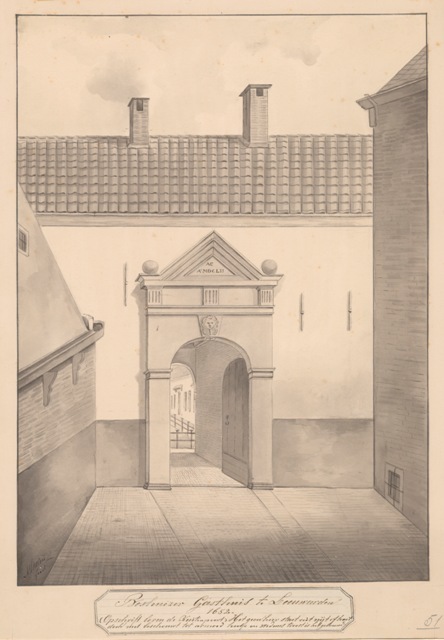 Gezicht op de poort van het Boshuizer Gasthuis te Leeuwarden.