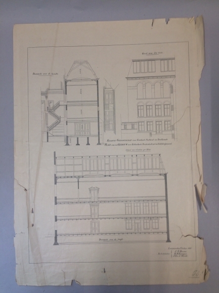 Tekening in lithografie van de gevel aan de tuin en doorsneden van de eerste uitbreiding van het Fries Museum