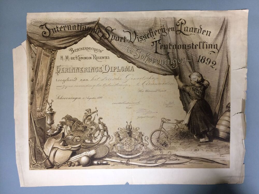Herinneringsdiploma toegekend aan het Fries Genootschap op de Internationale Sport-, Visscherij- en Paarden Tentoonstelling te Scheveningen 1892