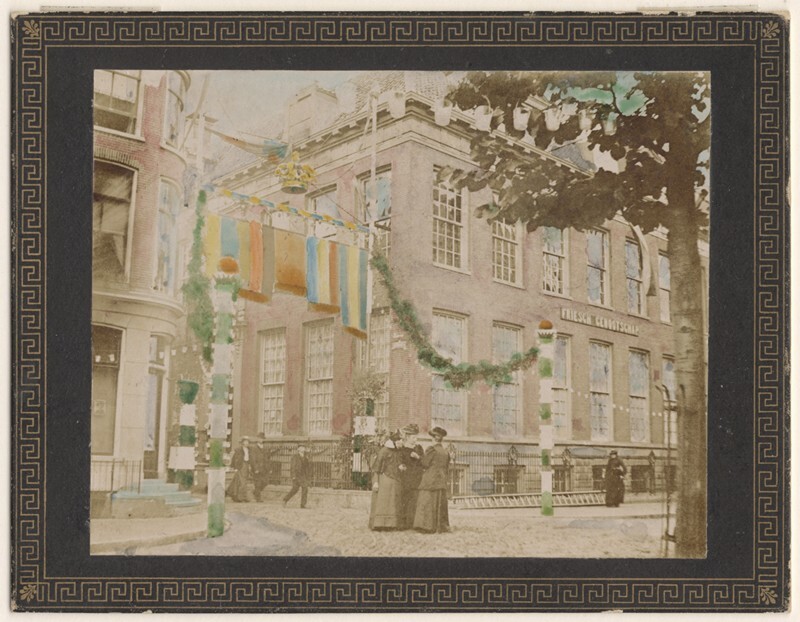 Hoek van het Eysingahuis met de erepoort voor de Koningsstraat ter gelegenheid van het bezoek van H.M. de Koningin in 1905 aan het Fries Museum te Leeuwarden