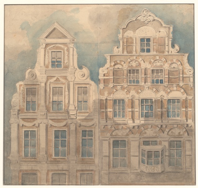 Gezicht op het bovengedeelte van de woningen in de St. Jacobsstraat no. 13 en no. 11 te Leeuwarden