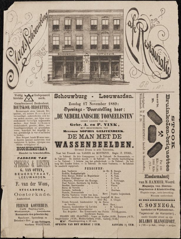 Programma van De man met de wassenbeelden door De Nederlandsche Toneelisten in de Schouwburg te Leeuwarden op 17 november 1889