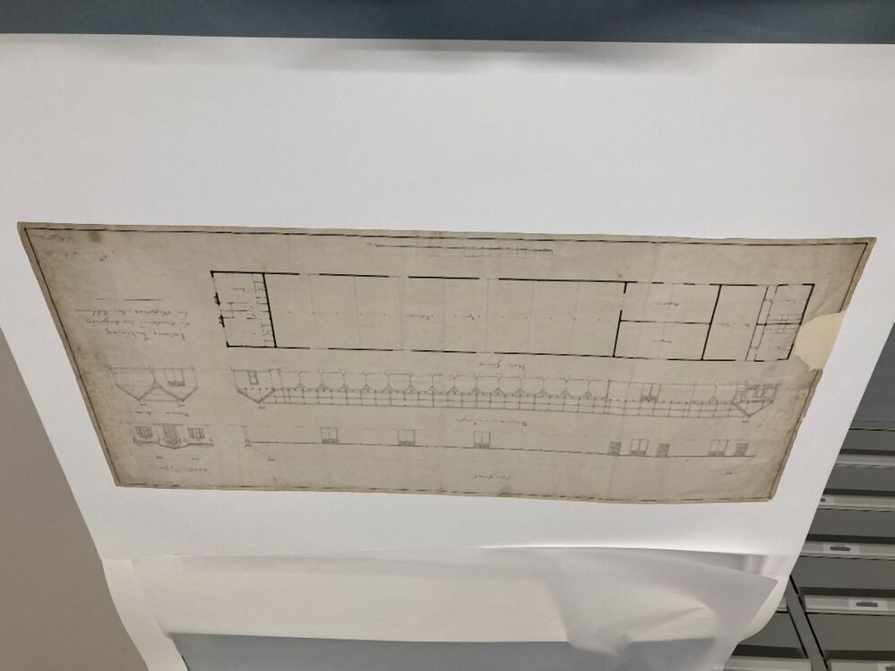 Ontwerpteekening van vier woonkamers, eene bergplaats, eene slagtplaats en twee pakhuizen