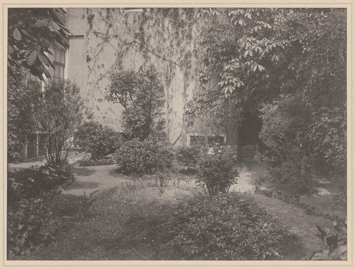 Afbeelding van de tuin van het Bumahuis op de hoek van de Bollemanssteeg en de Grote Kerkstraat te Leeuwarden