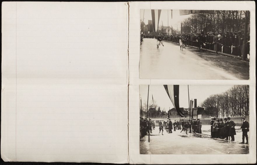 Hardrijderij op de stadsgracht achter de Prinsentuin en op de ijsbaan aan de Bleekerstraat bij het bezoek van H.M. de Koningin met prinses Juliana en prins Hendrik