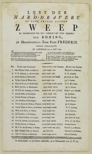 Lijst der hard-dravery op eene fraaije gouden zweep bij gelegenheid van het verblijf van Zijne Majesteit den Koning en hoogstdeszelfs zoon Prins Frederik binnen Leeuwarden op zaturdag den 31 mey 1823