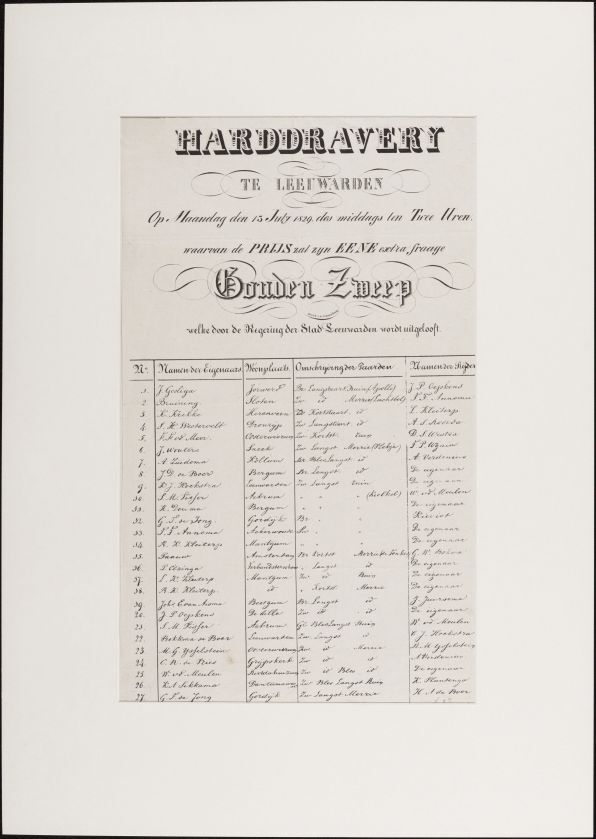 Harddravery te Leeuwarden op maandag den 13 july 1829 des middags ten twee uren. De prijs zal zijn eene extra fraaije gouden zweep