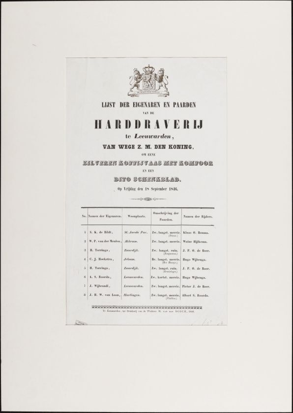 Lijst der eigenaren en paarden van de harddraverij te Leeuwarden van wege Z.M. den Koning op vrijdag den 18 september 1846
