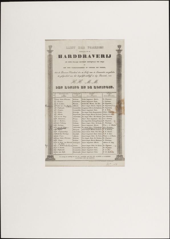 Lijst der paarden toegelaten tot de harddraverij om eene fraaije zilveren koffijvaas tot prijs ter gelegenheid van het heugelijk verblijf in deze provincie van H.H. M.M. den Koning en de Koningin