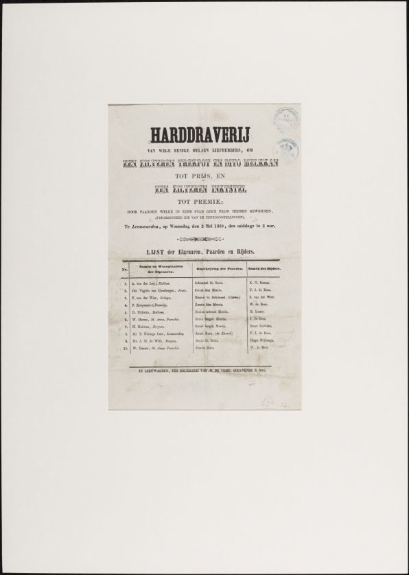 Harddraverij van wege eenige heeren liefhebbers om een zilveren trekpot en dito melkkan tot prijs te Leeuwarden op woensdag den 2 mei 1860.
