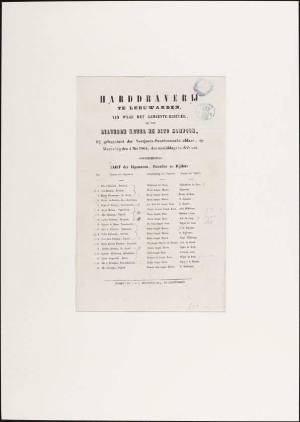 Harddraverij te Leeuwarden van wege het gemeentebestuur om een zilveren ketel en dito komfoor bij gelegenheid der voorjaarspaardenmarkt