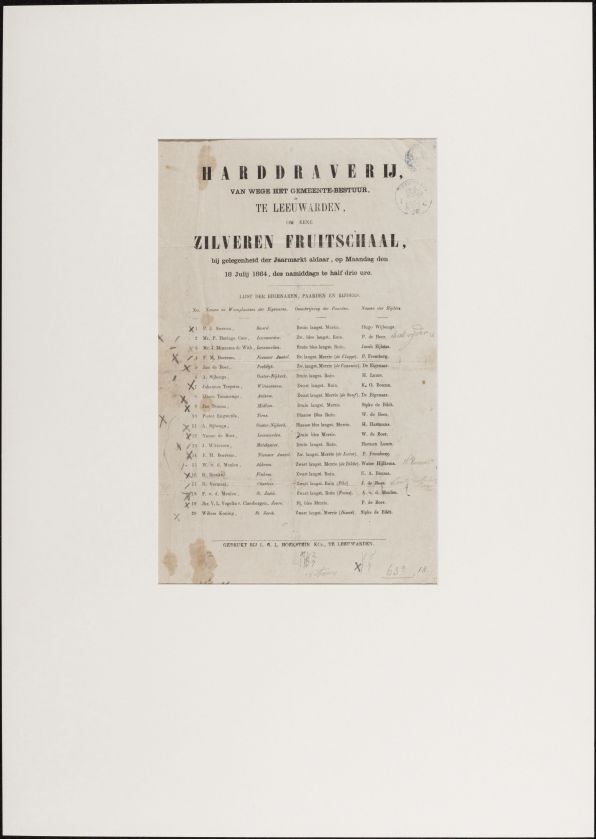 Harddraverij van wege het gemeentebestuur te Leeuwarden om een zilveren fruitschaal, bij gelegenheid der jaarmarkt