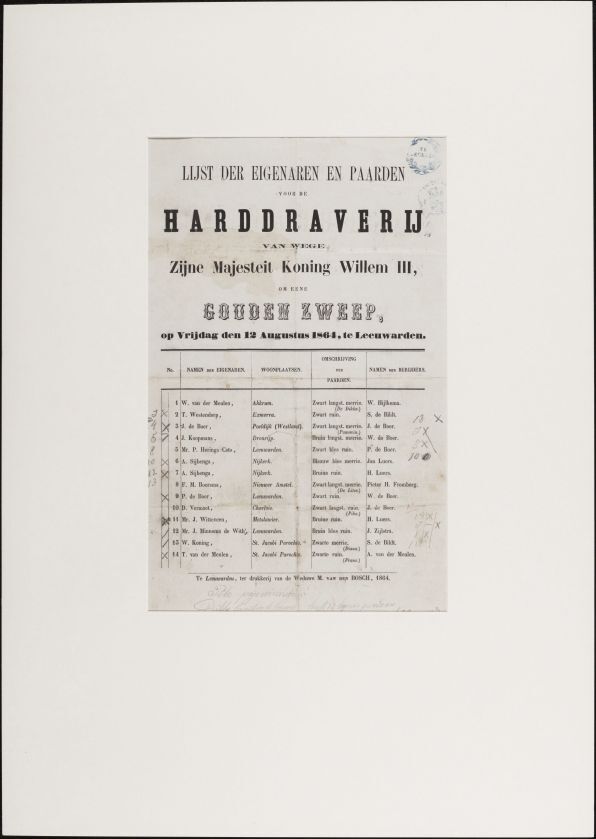 Lijst der eigenaren en paarden voor de harddraverij van wege Zijne Majesteit Koning Willem III, om eene gouden zweep op vrijdag den 12 augustus 1864 te Leeuwarden