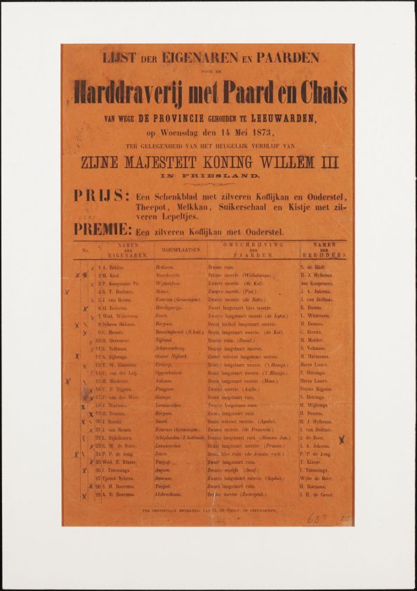 Lijst der eigenaren en paarden van de harddraverij met paard en chais van wege de provincie gehouden te Leeuwarden op woensdag den 14 mei 1873, ter gelegenheid van het heugelijke verblijf van Zijne Majesteit Koning Willem III in Friesland. Prijs: een schenkblad met zilveren koffijkan [...]