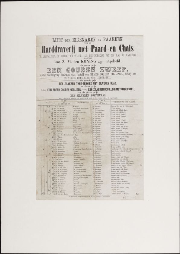 Lijst der eigenaren en paarden voor de harddraverij met paard en chais te Leeuwarden op vrijdag den 18 junij 1875, den gedenkdag van den slag bij Waterloo [...]