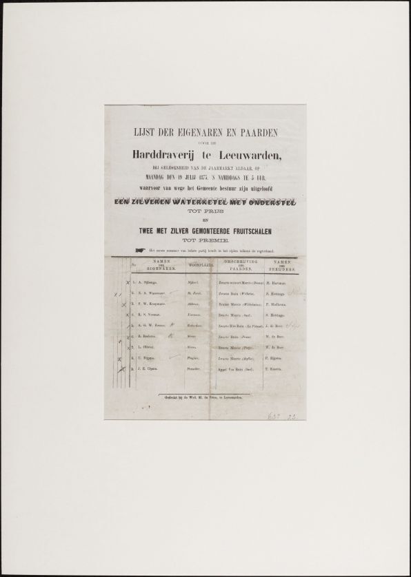 Lijst der eigenaren en paarden voor de harddraverij te Leeuwarden, bij gelegenheid van de jaarmarkt aldaar, op maandag den 19 julij 1875 [...] waarvoor van wege het gemeente bestuur zijn uitgeloofd een zilveren waterketel met onderstel tot prijs [...]